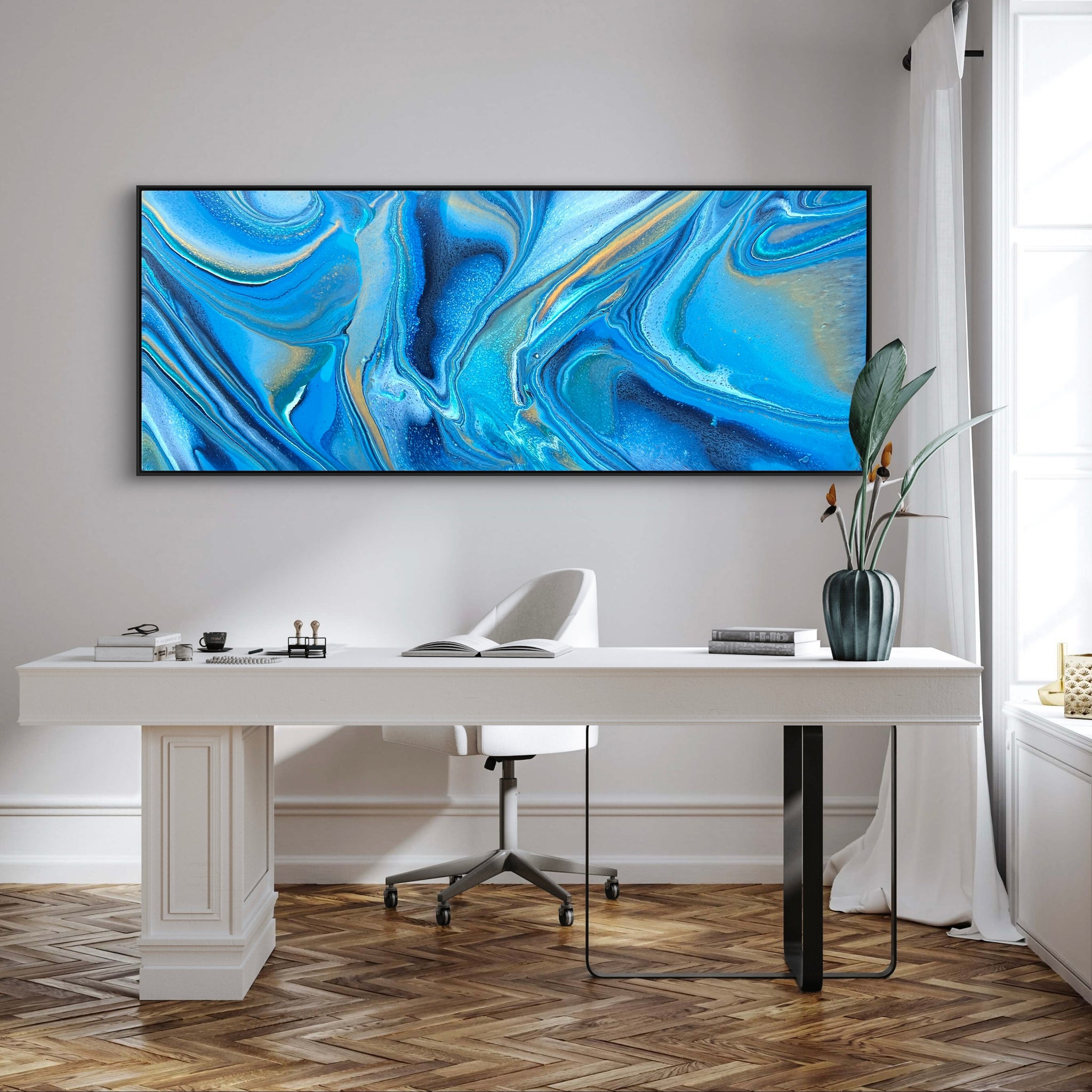 I also offer my own personal high quality frames. I can provide black, white, midnight blue or natural Tasmanian oak floating frames depending on your preference. Whilst my paintings look stunning unframed… a frame can add another level of interest and further tie the painting into your décor.