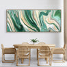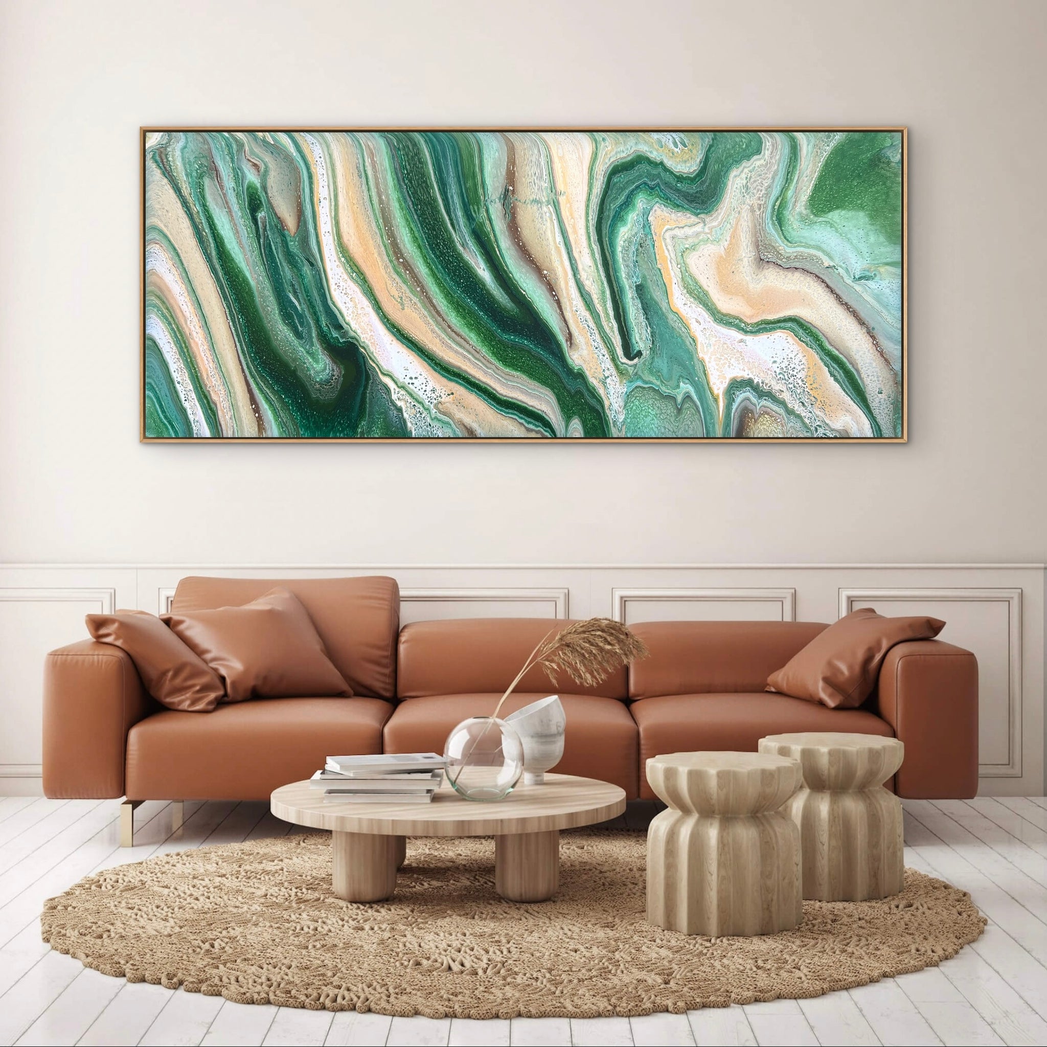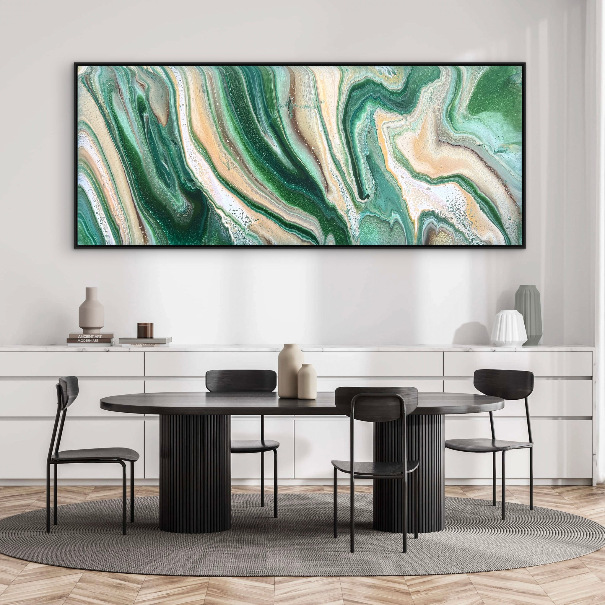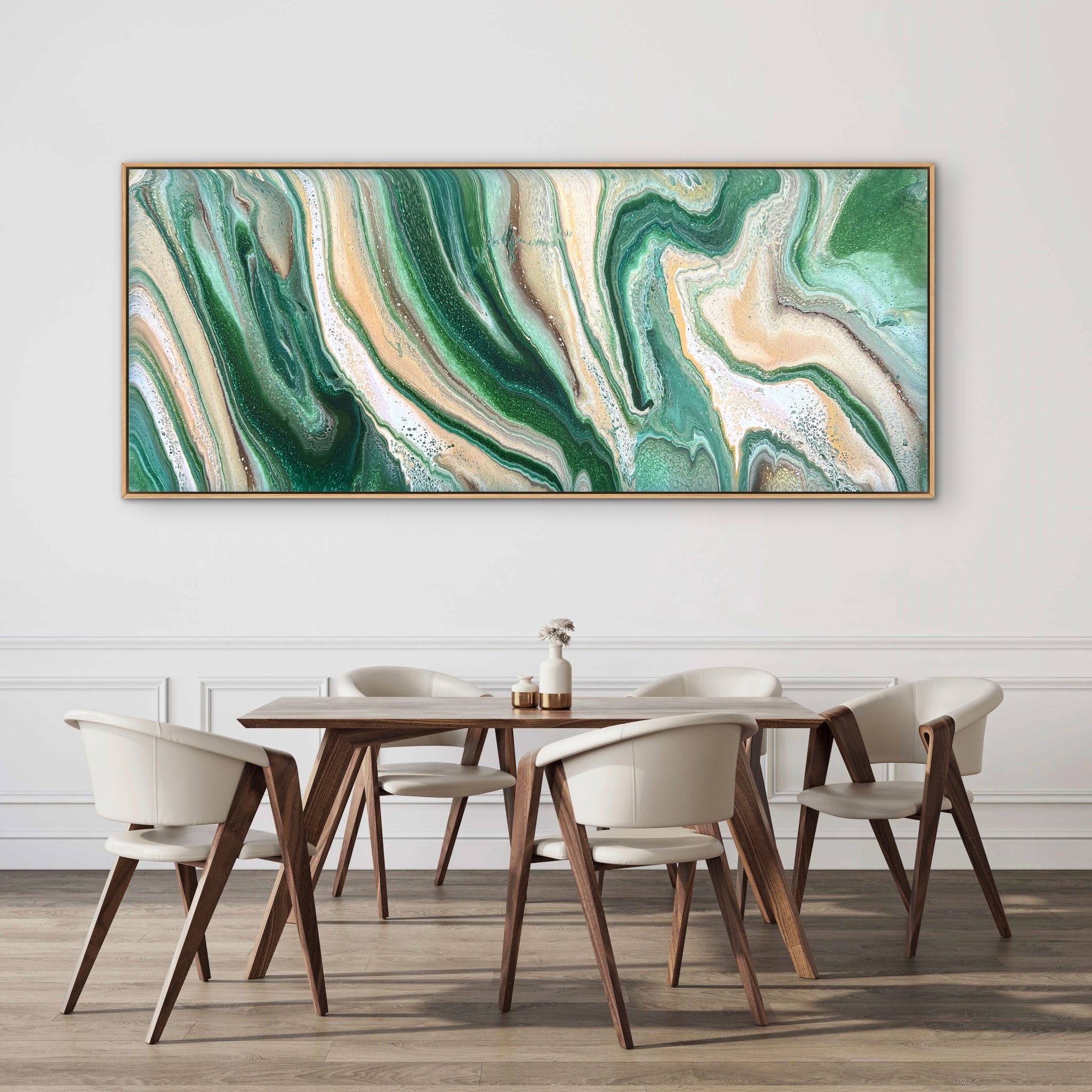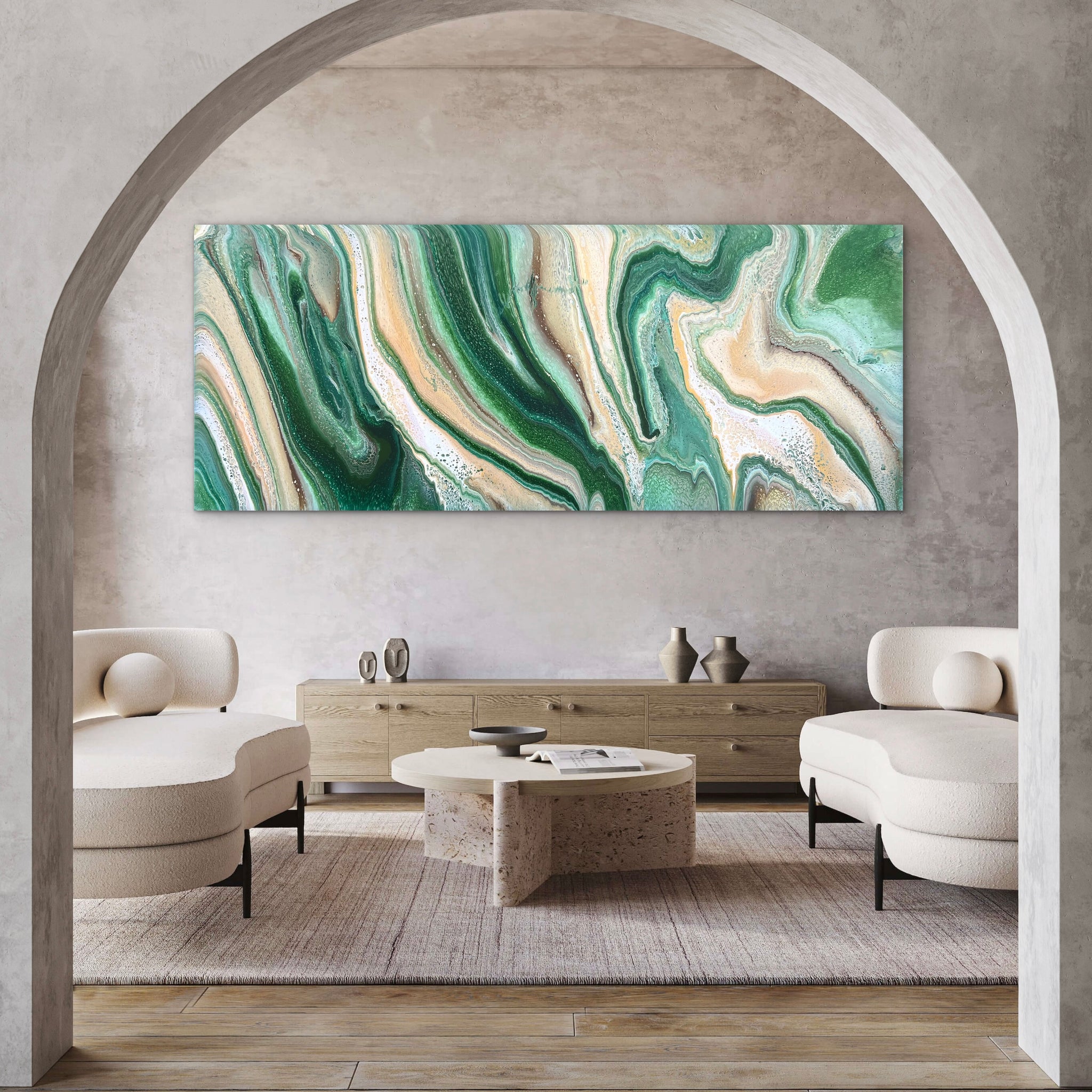 This beautiful piece is 240cm x 100cm and features shades of green, metallic gold, cream, umber and white acrylics. I will sign the bottom left corner before despatch just in case you’d like it hung a different way.