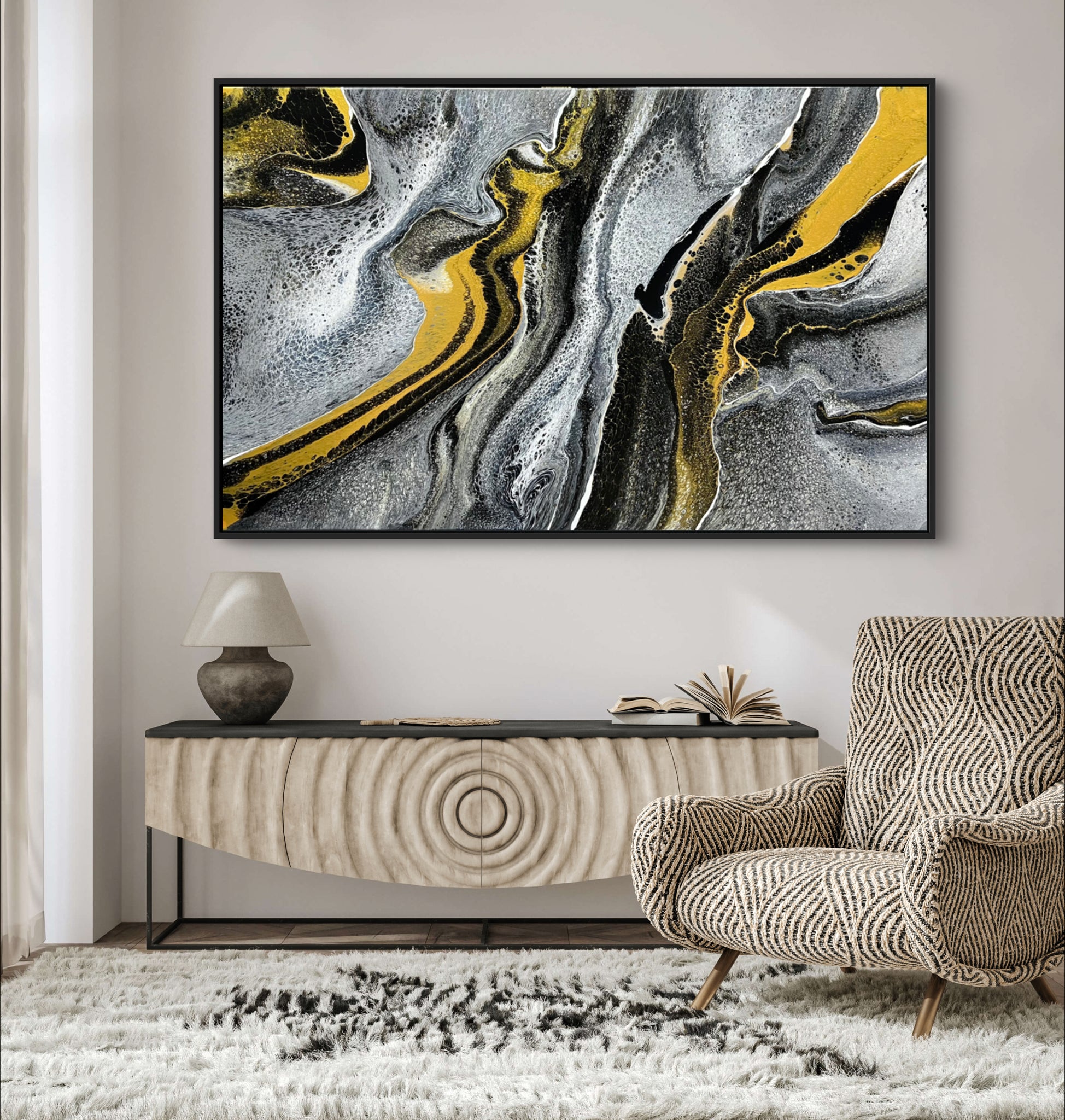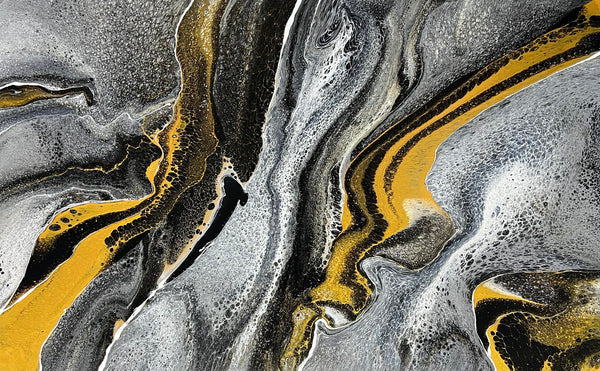 This beautiful piece is 160cm x 100cm and features black, grey, paynes grey, silver, metallic gold and white acrylics. I will sign the bottom left corner once the orientation is confirmed as this painting can be hung multiple ways.