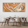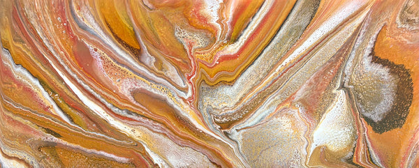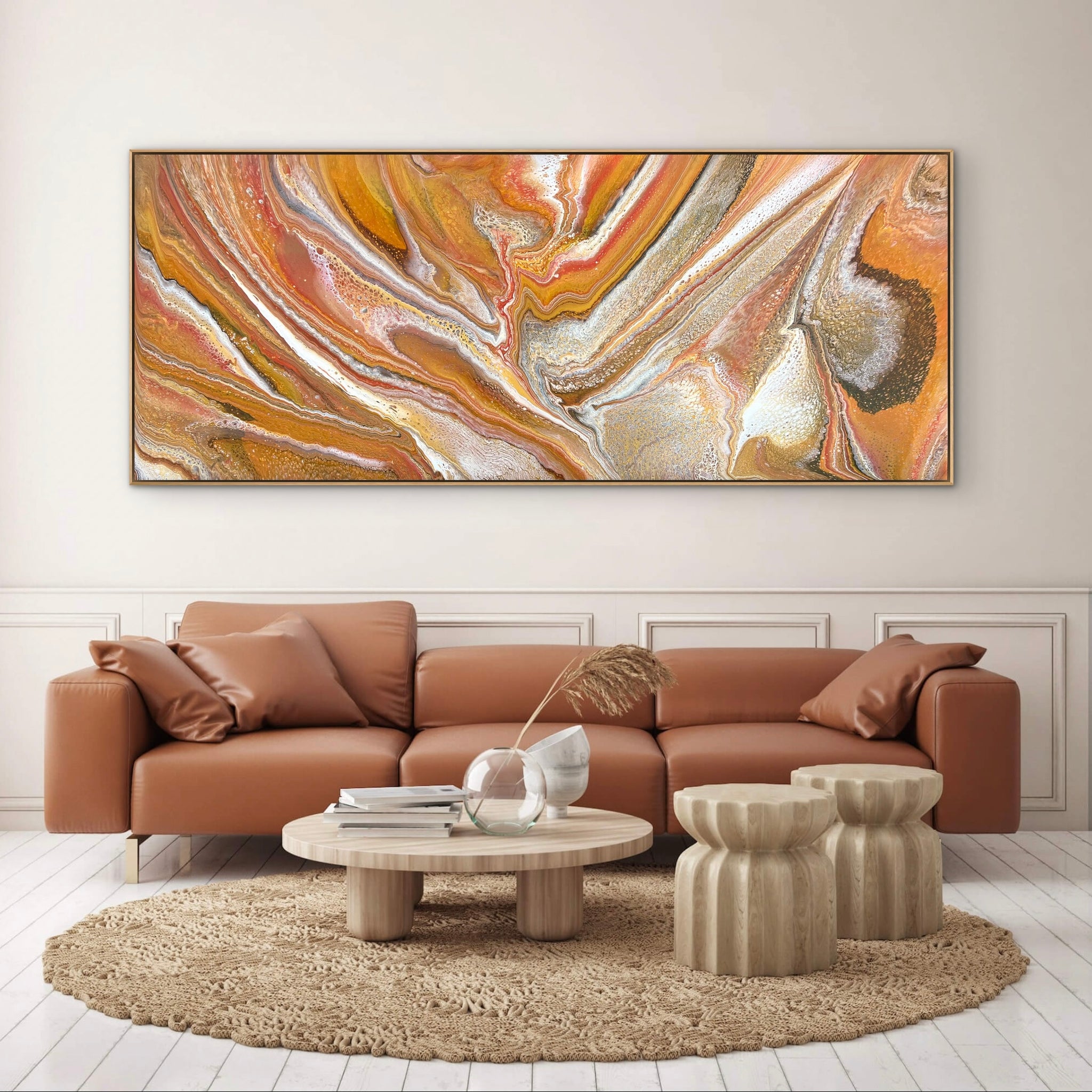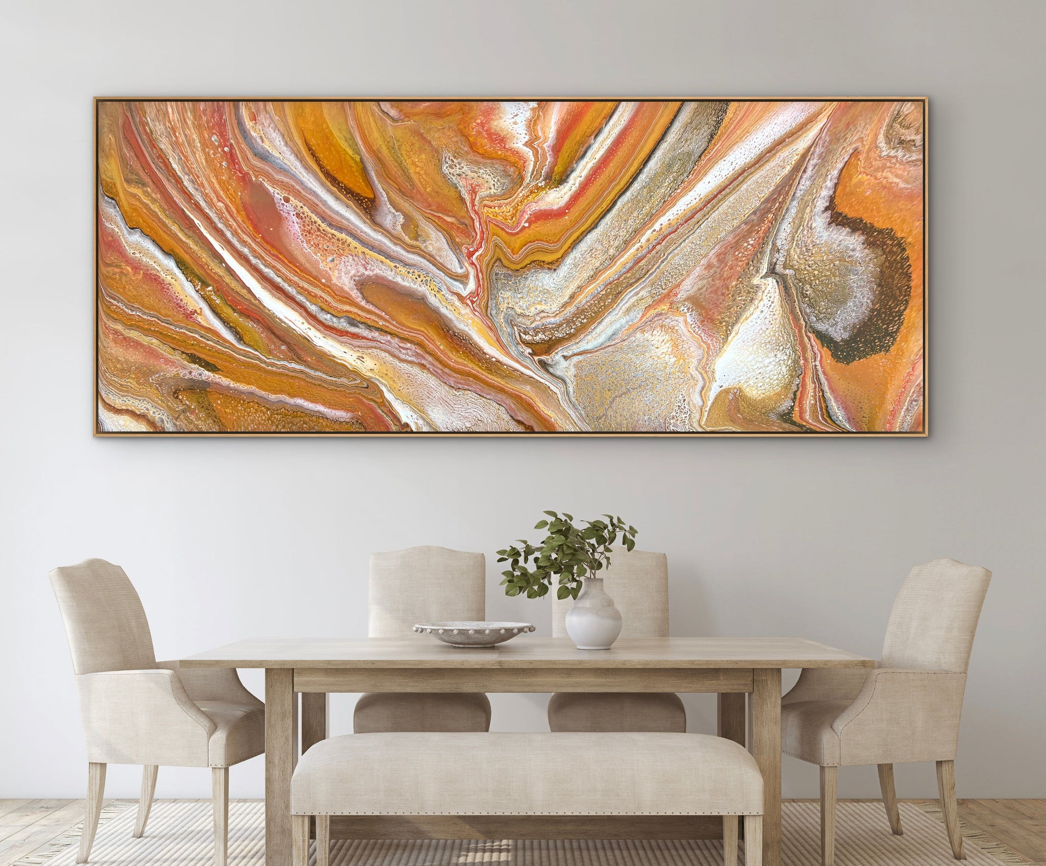 This beautiful piece is 240cm x 100cm and features shades of sienna, orange, gold, cream, umber, bronze, copper, black and white acrylics.