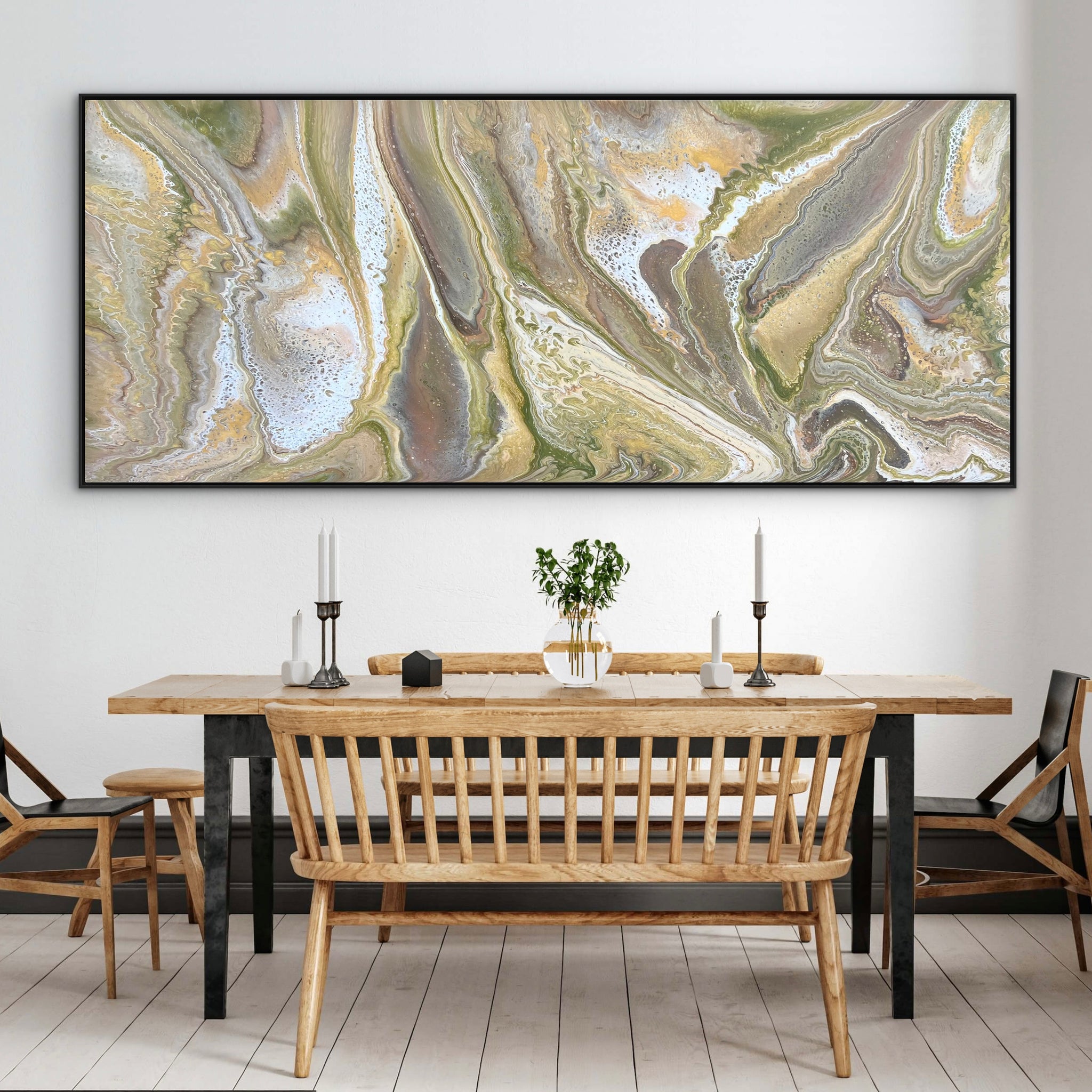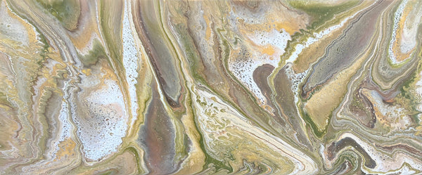 This beautiful piece is 240cm x 100cm and features shades of olive green, gold, cream, umber, bronze, copper, black and white acrylics. I will sign the bottom left corner before despatch just in case you’d like it hung a different way.