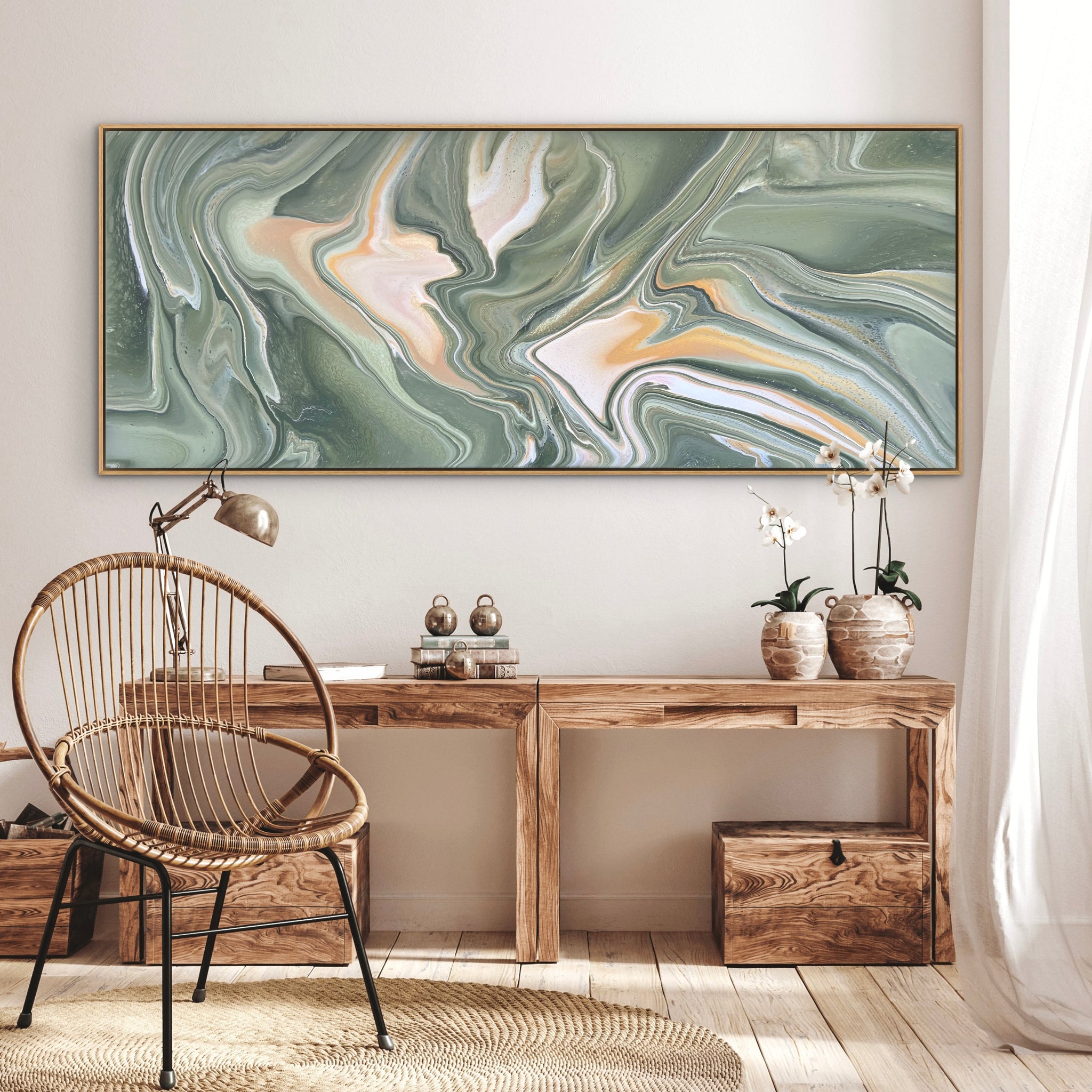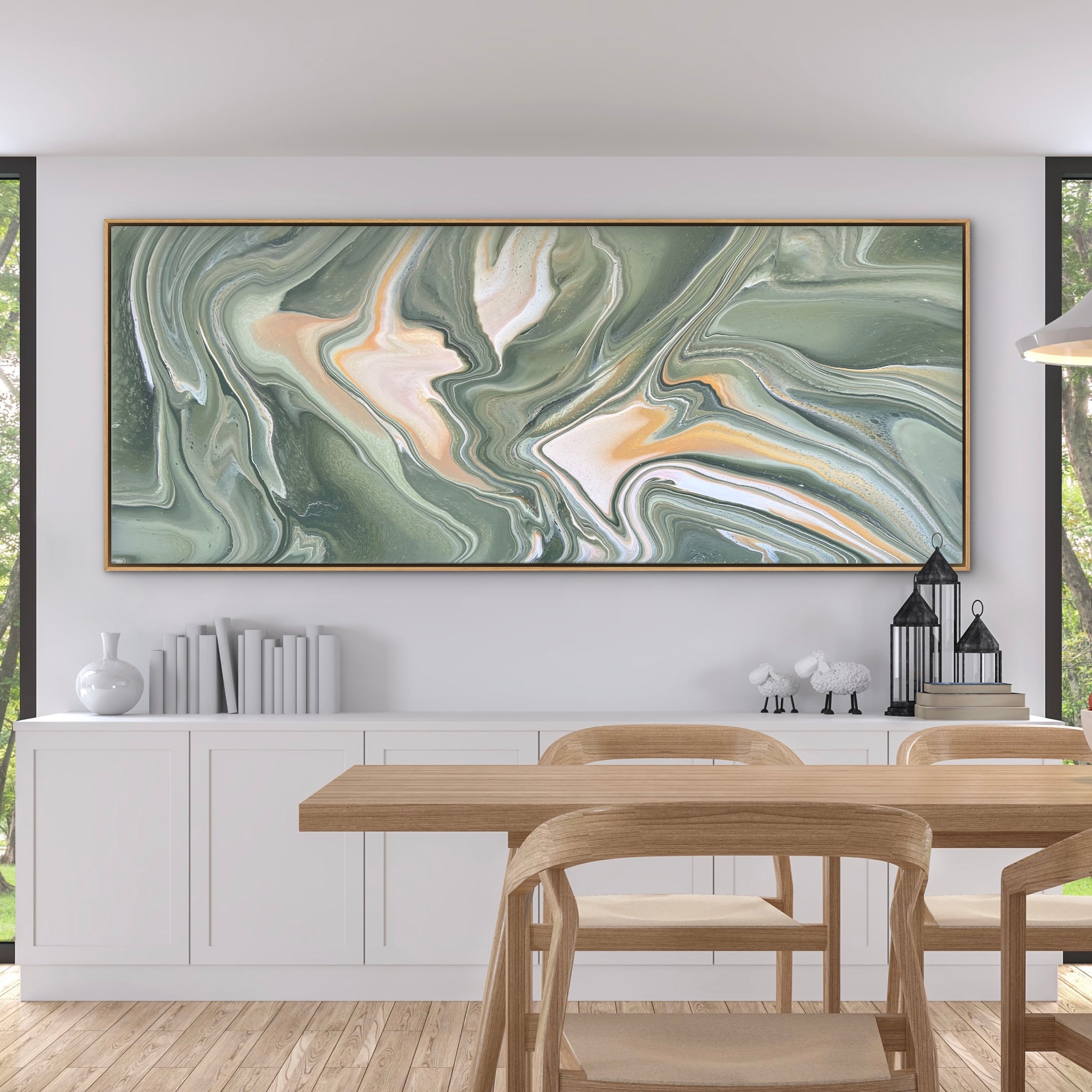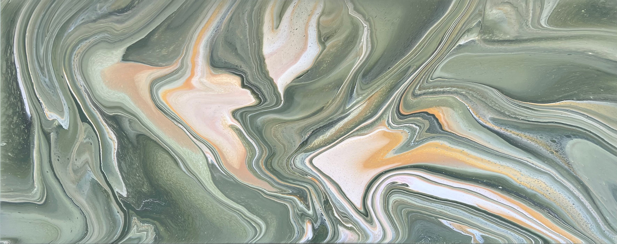 This beautiful piece is 200cm x 80cm and features shades of eucalyptus greens, metallic gold, cream and white acrylics. I will sign the bottom left corner before despatch just in case you’d like it hung a different way.