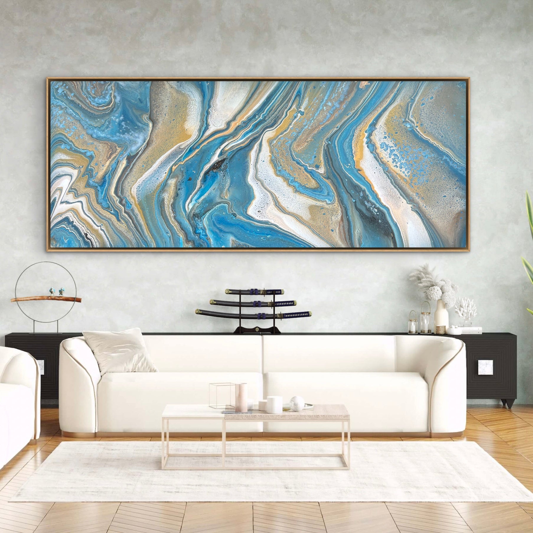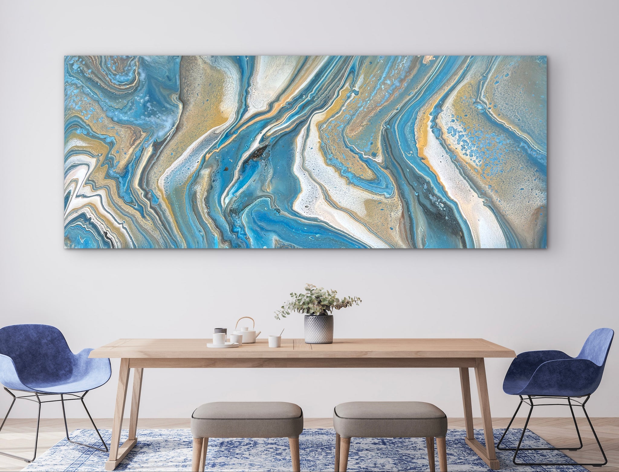 This gorgeous piece is 240cm x 100cm and features blue, gold, cream, umber, bronze and white acrylics. I will sign the bottom left corner once the orientation is confirmed just in case you’d like it hung a different way.