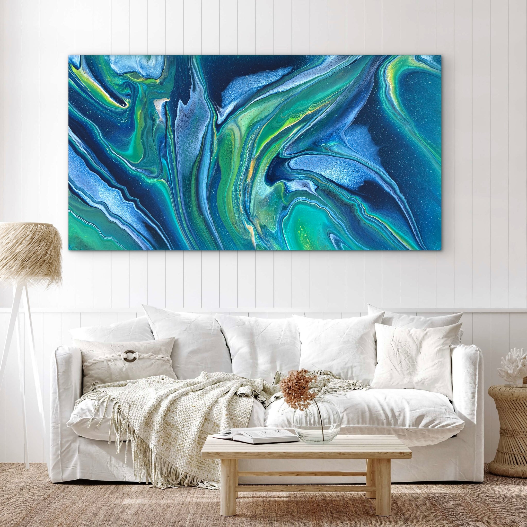This stunning piece is 190cm x 100cm and features shades of navy blue, royal blue, teal, green, turquoise, metallic gold and white acrylics. I will sign the bottom left corner when the orientation is confirmed as this painting can be hung multiple ways.